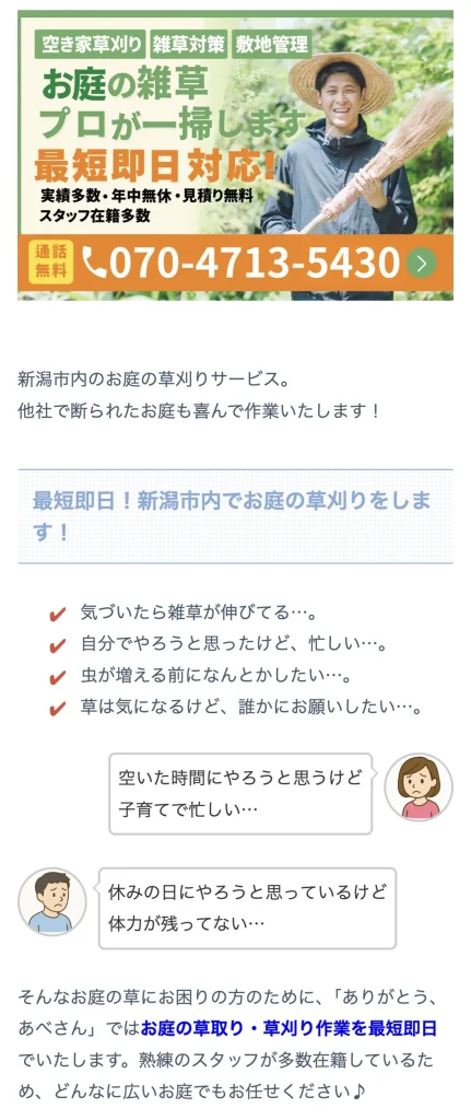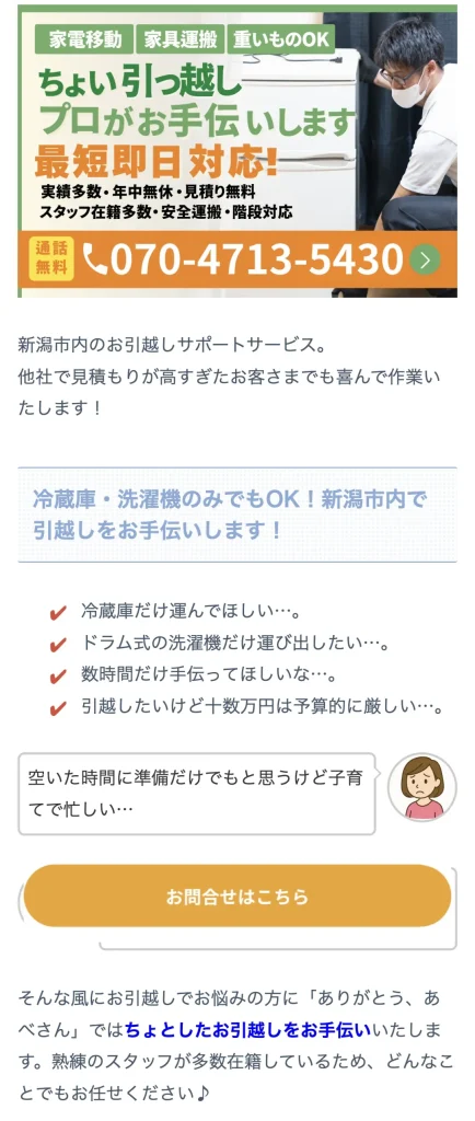 「ホームページを公開してから「新潟市 便利屋」で上位表示され、多くの問い合わせをいただけるようになりました!GoogleマップやWeb広告のサポートまでしてくださって、本当に助かっています。」(新潟市/ありがとう、、あべさん。)